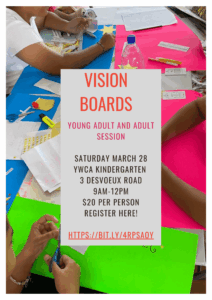 Vision Boards: Adult session We have listened to your many requests and are offering a vision board making session for adults this month! Join us to map out your goals for the year in this fun and creative morning. Sat March 28th YWCA Kindy, Des Vouex Rd 9am- noon $20 per person You can register using the QR code […] Read more »